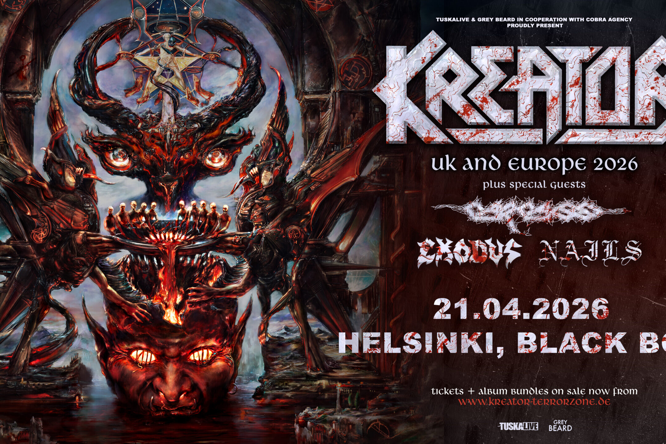 Vanhan liiton thrash – ja death metallin ystäville on luvassa ns. makeaa mahan täydeltä, kun Kreator, Carcass, Exodus ja Nails paaluttavat Helsingin jäähallin Black Boxissa ”Krushers Of The World”-kiertueensa Suomen etapilla 21. huhtikuuta 2026.
